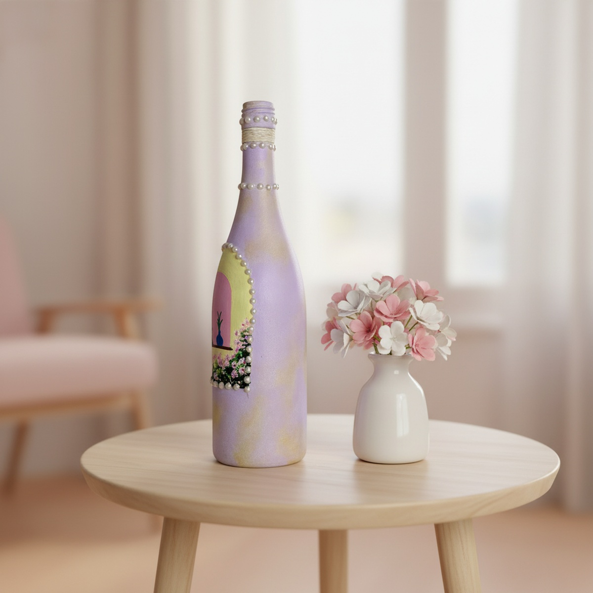 Handcrafted from recycled glass, this lavender-painted bottle vase brings soft elegance and mindful charm to your space. Detailed with beads for a subtle sparkle, it’s perfect for dried flowers or as a sustainable decor accent.